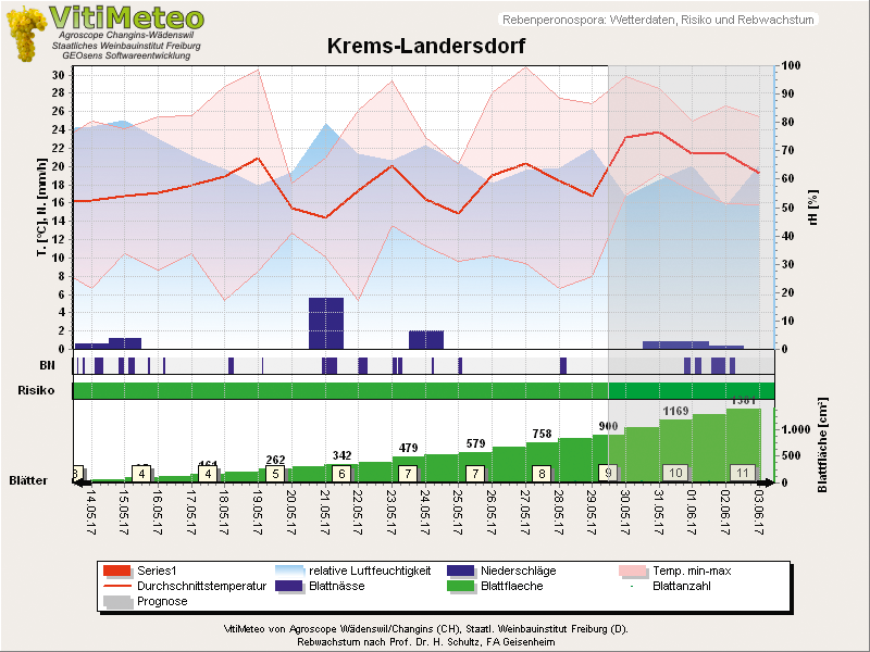 Der Neuzuwachs der Rebe muss vor Peronosporainfektionen geschützt werden. Liegt ein Neuzuwachs seit der letzten Applikation von mehr als 400 cm² Blattfläche pro Trieb vor, so muss man sich über eine weitere Behandlung Gedanken machen. Das Warndienstmodell VitiMeteo (www. vitimeteo.at) liefert entsprechende Informationen zum Rebenwachstum sowie zum herrschenden Infektionsdruck durch Peronospora. Im Internet stehen von den im System angelegten Warndienststationen die entsprechenden Daten des durchschnittlich errechneten Blattflächenzuwachses in cm² sowie die Anzahl Haupttriebblätter pro Trieb auf den betreffenden Grafiken zur Verfügung.